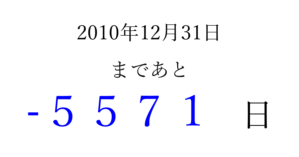 2010年12月31日(金)は もう 0000 日過ぎました 追加すると、トップページからすぐ選べるようになります ※2026/04/02現在の結果です。 最新の状態に更新する ↓シェアして、タイムライン上にカウントダウンを表示しよう!↓ 📤 この結果を共有する Tweet シェア Threads Bluesky 別の日付でカウントダウン 2010年12月のカレンダー このページをブックマークに追加すると、いつでもカウントダウンを確認できます。 (PC: Ctrl+D / Mac: ⌘+D) hitome-notes.comでは以下のページも運営しています。 指定日と期間から日付を計算 | ガチャ確率計算・シミュレーション | プライバシー・ポリシー 運営者:Avocado
