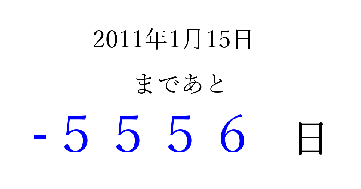 2011年1月15日(土)は もう 0000 日過ぎました 追加すると、トップページからすぐ選べるようになります ※2026/04/02現在の結果です。 最新の状態に更新する ↓シェアして、タイムライン上にカウントダウンを表示しよう!↓ 📤 この結果を共有する Tweet シェア Threads Bluesky 別の日付でカウントダウン 2011年1月のカレンダー このページをブックマークに追加すると、いつでもカウントダウンを確認できます。 (PC: Ctrl+D / Mac: ⌘+D) hitome-notes.comでは以下のページも運営しています。 指定日と期間から日付を計算 | ガチャ確率計算・シミュレーション | プライバシー・ポリシー 運営者:Avocado