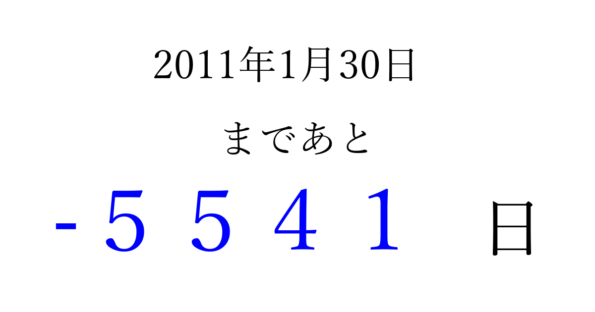 2011年1月30日(日)は もう 0000 日過ぎました 追加すると、トップページからすぐ選べるようになります ※2026/04/02現在の結果です。 最新の状態に更新する ↓シェアして、タイムライン上にカウントダウンを表示しよう!↓ 📤 この結果を共有する Tweet シェア Threads Bluesky 別の日付でカウントダウン 2011年1月のカレンダー このページをブックマークに追加すると、いつでもカウントダウンを確認できます。 (PC: Ctrl+D / Mac: ⌘+D) hitome-notes.comでは以下のページも運営しています。 指定日と期間から日付を計算 | ガチャ確率計算・シミュレーション | プライバシー・ポリシー 運営者:Avocado