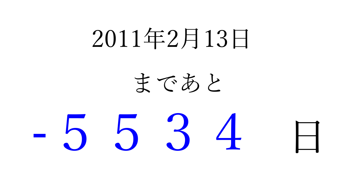 2011年2月13日(日)は もう 0000 日過ぎました 追加すると、トップページからすぐ選べるようになります ※2026/04/09現在の結果です。 最新の状態に更新する ↓シェアして、タイムライン上にカウントダウンを表示しよう!↓ 📤 この結果を共有する Tweet シェア Threads Bluesky 別の日付でカウントダウン 2011年2月のカレンダー このページをブックマークに追加すると、いつでもカウントダウンを確認できます。 (PC: Ctrl+D / Mac: ⌘+D) hitome-notes.comでは以下のページも運営しています。 指定日と期間から日付を計算 | ガチャ確率計算・シミュレーション | プライバシー・ポリシー 運営者:Avocado