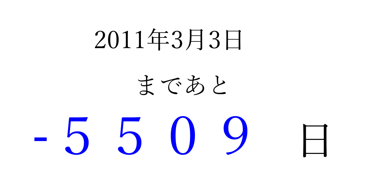 2011年3月3日(木)は もう 0000 日過ぎました 追加すると、トップページからすぐ選べるようになります ※2026/04/02現在の結果です。 最新の状態に更新する ↓シェアして、タイムライン上にカウントダウンを表示しよう!↓ 📤 この結果を共有する Tweet シェア Threads Bluesky 別の日付でカウントダウン 2011年3月のカレンダー このページをブックマークに追加すると、いつでもカウントダウンを確認できます。 (PC: Ctrl+D / Mac: ⌘+D) hitome-notes.comでは以下のページも運営しています。 指定日と期間から日付を計算 | ガチャ確率計算・シミュレーション | プライバシー・ポリシー 運営者:Avocado