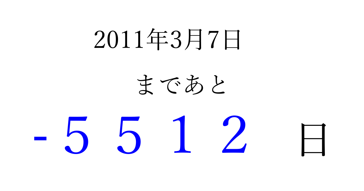 2011年3月7日(月)は もう 0000 日過ぎました 追加すると、トップページからすぐ選べるようになります ※2026/04/09現在の結果です。 最新の状態に更新する ↓シェアして、タイムライン上にカウントダウンを表示しよう!↓ 📤 この結果を共有する Tweet シェア Threads Bluesky 別の日付でカウントダウン 2011年3月のカレンダー このページをブックマークに追加すると、いつでもカウントダウンを確認できます。 (PC: Ctrl+D / Mac: ⌘+D) hitome-notes.comでは以下のページも運営しています。 指定日と期間から日付を計算 | ガチャ確率計算・シミュレーション | プライバシー・ポリシー 運営者:Avocado