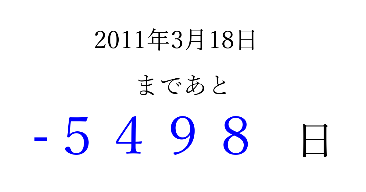 2011年3月18日(金)は もう 0000 日過ぎました 追加すると、トップページからすぐ選べるようになります ※2026/04/06現在の結果です。 最新の状態に更新する ↓シェアして、タイムライン上にカウントダウンを表示しよう!↓ 📤 この結果を共有する Tweet シェア Threads Bluesky 別の日付でカウントダウン 2011年3月のカレンダー このページをブックマークに追加すると、いつでもカウントダウンを確認できます。 (PC: Ctrl+D / Mac: ⌘+D) hitome-notes.comでは以下のページも運営しています。 指定日と期間から日付を計算 | ガチャ確率計算・シミュレーション | プライバシー・ポリシー 運営者:Avocado