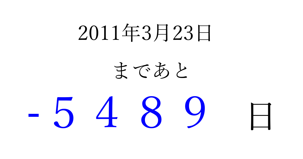 2011年3月23日(水)は もう 0000 日過ぎました 追加すると、トップページからすぐ選べるようになります ※2026/04/02現在の結果です。 最新の状態に更新する ↓シェアして、タイムライン上にカウントダウンを表示しよう!↓ 📤 この結果を共有する Tweet シェア Threads Bluesky 別の日付でカウントダウン 2011年3月のカレンダー このページをブックマークに追加すると、いつでもカウントダウンを確認できます。 (PC: Ctrl+D / Mac: ⌘+D) hitome-notes.comでは以下のページも運営しています。 指定日と期間から日付を計算 | ガチャ確率計算・シミュレーション | プライバシー・ポリシー 運営者:Avocado