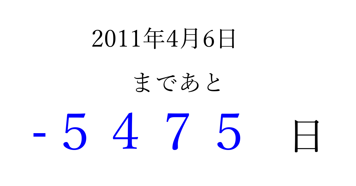 2011年4月6日(水)は もう 0000 日過ぎました 追加すると、トップページからすぐ選べるようになります ※2026/04/02現在の結果です。 最新の状態に更新する ↓シェアして、タイムライン上にカウントダウンを表示しよう!↓ 📤 この結果を共有する Tweet シェア Threads Bluesky 別の日付でカウントダウン 2011年4月のカレンダー このページをブックマークに追加すると、いつでもカウントダウンを確認できます。 (PC: Ctrl+D / Mac: ⌘+D) hitome-notes.comでは以下のページも運営しています。 指定日と期間から日付を計算 | ガチャ確率計算・シミュレーション | プライバシー・ポリシー 運営者:Avocado