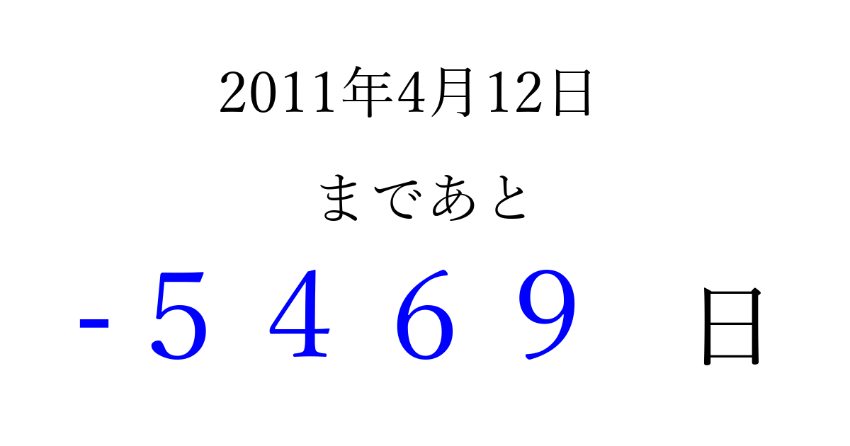 2011年4月12日(火)は もう 0000 日過ぎました 追加すると、トップページからすぐ選べるようになります ※2026/04/02現在の結果です。 最新の状態に更新する ↓シェアして、タイムライン上にカウントダウンを表示しよう!↓ 📤 この結果を共有する Tweet シェア Threads Bluesky 別の日付でカウントダウン 2011年4月のカレンダー このページをブックマークに追加すると、いつでもカウントダウンを確認できます。 (PC: Ctrl+D / Mac: ⌘+D) hitome-notes.comでは以下のページも運営しています。 指定日と期間から日付を計算 | ガチャ確率計算・シミュレーション | プライバシー・ポリシー 運営者:Avocado