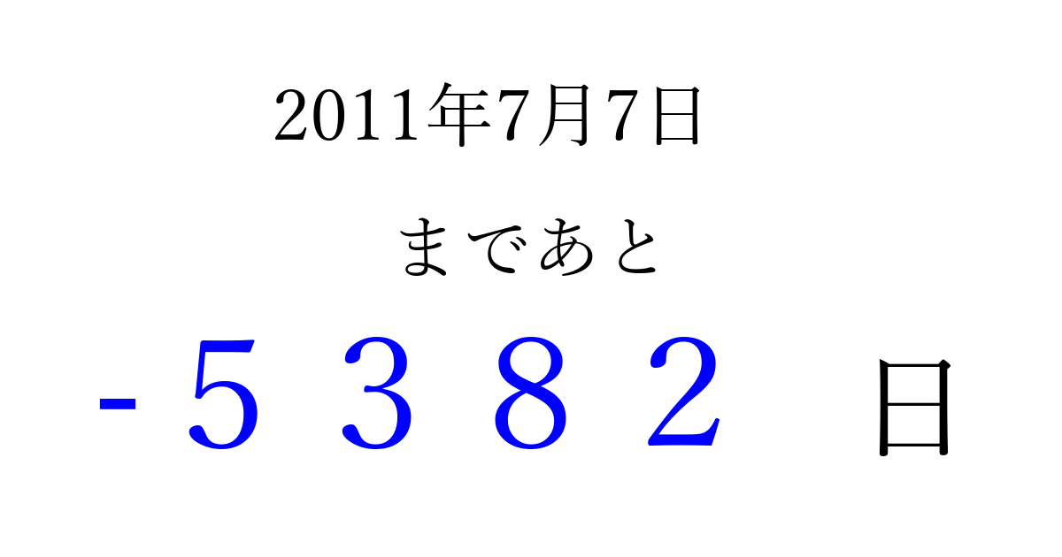2011年7月7日(木)は もう 0000 日過ぎました 追加すると、トップページからすぐ選べるようになります ※2026/04/01現在の結果です。 最新の状態に更新する ↓シェアして、タイムライン上にカウントダウンを表示しよう!↓ 📤 この結果を共有する Tweet シェア Threads Bluesky 別の日付でカウントダウン 2011年7月のカレンダー このページをブックマークに追加すると、いつでもカウントダウンを確認できます。 (PC: Ctrl+D / Mac: ⌘+D) hitome-notes.comでは以下のページも運営しています。 指定日と期間から日付を計算 | ガチャ確率計算・シミュレーション | プライバシー・ポリシー 運営者:Avocado