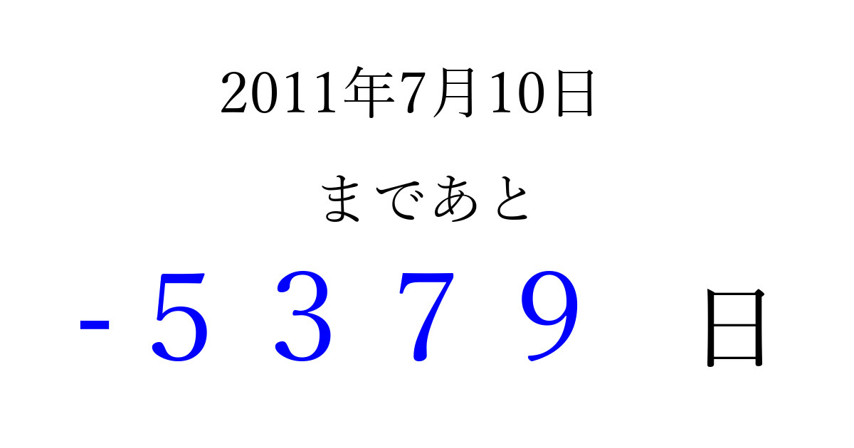 2011年7月10日(日)は もう 0000 日過ぎました 追加すると、トップページからすぐ選べるようになります ※2026/04/01現在の結果です。 最新の状態に更新する ↓シェアして、タイムライン上にカウントダウンを表示しよう!↓ 📤 この結果を共有する Tweet シェア Threads Bluesky 別の日付でカウントダウン 2011年7月のカレンダー このページをブックマークに追加すると、いつでもカウントダウンを確認できます。 (PC: Ctrl+D / Mac: ⌘+D) hitome-notes.comでは以下のページも運営しています。 指定日と期間から日付を計算 | ガチャ確率計算・シミュレーション | プライバシー・ポリシー 運営者:Avocado