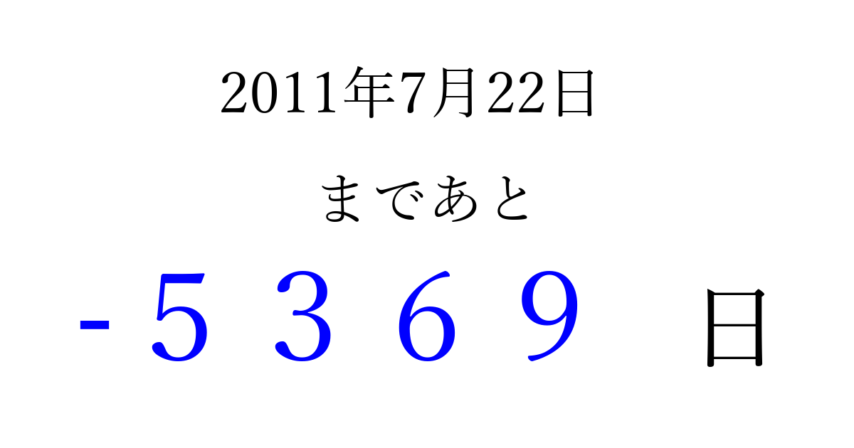 2011年7月22日(金)は もう 0000 日過ぎました 追加すると、トップページからすぐ選べるようになります ※2026/04/03現在の結果です。 最新の状態に更新する ↓シェアして、タイムライン上にカウントダウンを表示しよう!↓ 📤 この結果を共有する Tweet シェア Threads Bluesky 別の日付でカウントダウン 2011年7月のカレンダー このページをブックマークに追加すると、いつでもカウントダウンを確認できます。 (PC: Ctrl+D / Mac: ⌘+D) hitome-notes.comでは以下のページも運営しています。 指定日と期間から日付を計算 | ガチャ確率計算・シミュレーション | プライバシー・ポリシー 運営者:Avocado
