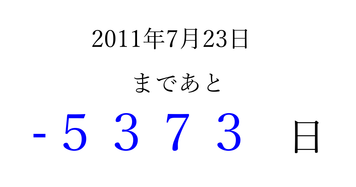 2011年7月23日(土)は もう 0000 日過ぎました 追加すると、トップページからすぐ選べるようになります ※2026/04/08現在の結果です。 最新の状態に更新する ↓シェアして、タイムライン上にカウントダウンを表示しよう!↓ 📤 この結果を共有する Tweet シェア Threads Bluesky 別の日付でカウントダウン 2011年7月のカレンダー このページをブックマークに追加すると、いつでもカウントダウンを確認できます。 (PC: Ctrl+D / Mac: ⌘+D) hitome-notes.comでは以下のページも運営しています。 指定日と期間から日付を計算 | ガチャ確率計算・シミュレーション | プライバシー・ポリシー 運営者:Avocado