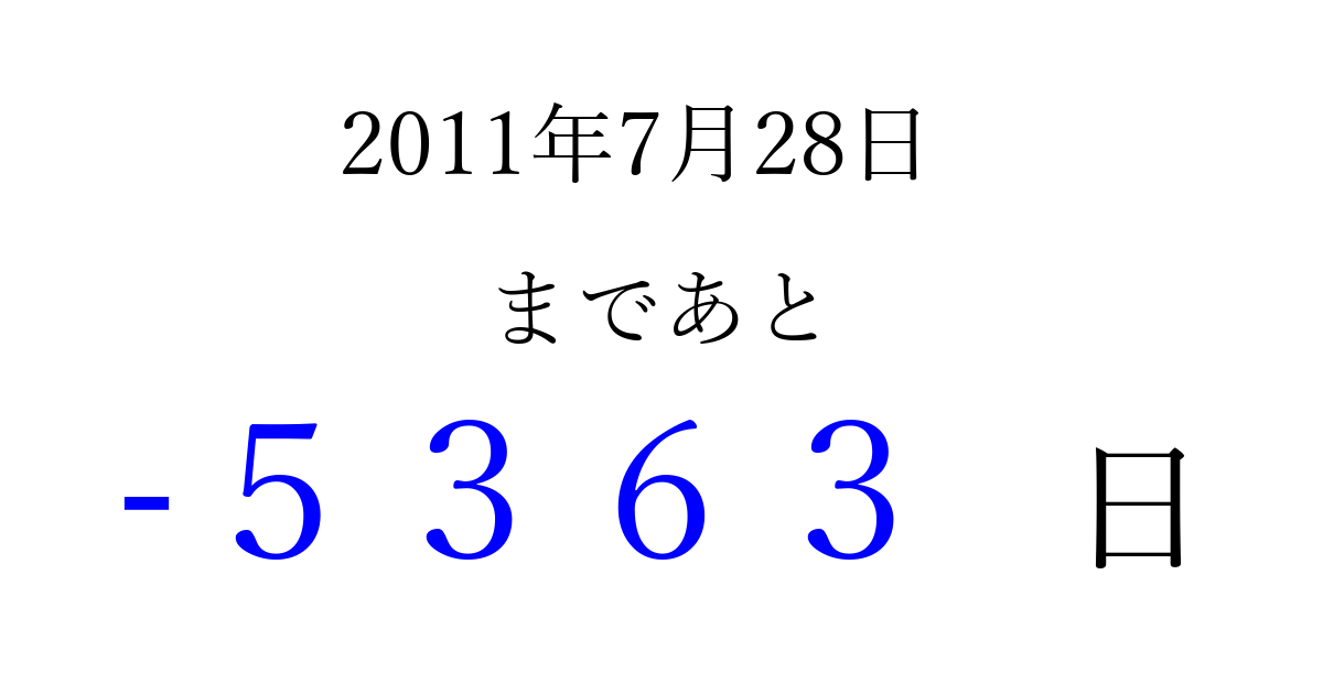 2011年7月28日(木)は もう 0000 日過ぎました 追加すると、トップページからすぐ選べるようになります ※2026/04/03現在の結果です。 最新の状態に更新する ↓シェアして、タイムライン上にカウントダウンを表示しよう!↓ 📤 この結果を共有する Tweet シェア Threads Bluesky 別の日付でカウントダウン 2011年7月のカレンダー このページをブックマークに追加すると、いつでもカウントダウンを確認できます。 (PC: Ctrl+D / Mac: ⌘+D) hitome-notes.comでは以下のページも運営しています。 指定日と期間から日付を計算 | ガチャ確率計算・シミュレーション | プライバシー・ポリシー 運営者:Avocado