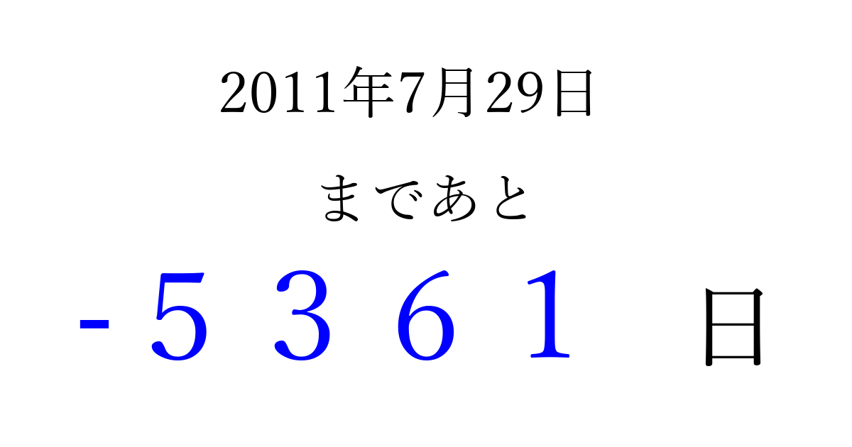2011年7月29日(金)は もう 0000 日過ぎました 追加すると、トップページからすぐ選べるようになります ※2026/04/02現在の結果です。 最新の状態に更新する ↓シェアして、タイムライン上にカウントダウンを表示しよう!↓ 📤 この結果を共有する Tweet シェア Threads Bluesky 別の日付でカウントダウン 2011年7月のカレンダー このページをブックマークに追加すると、いつでもカウントダウンを確認できます。 (PC: Ctrl+D / Mac: ⌘+D) hitome-notes.comでは以下のページも運営しています。 指定日と期間から日付を計算 | ガチャ確率計算・シミュレーション | プライバシー・ポリシー 運営者:Avocado