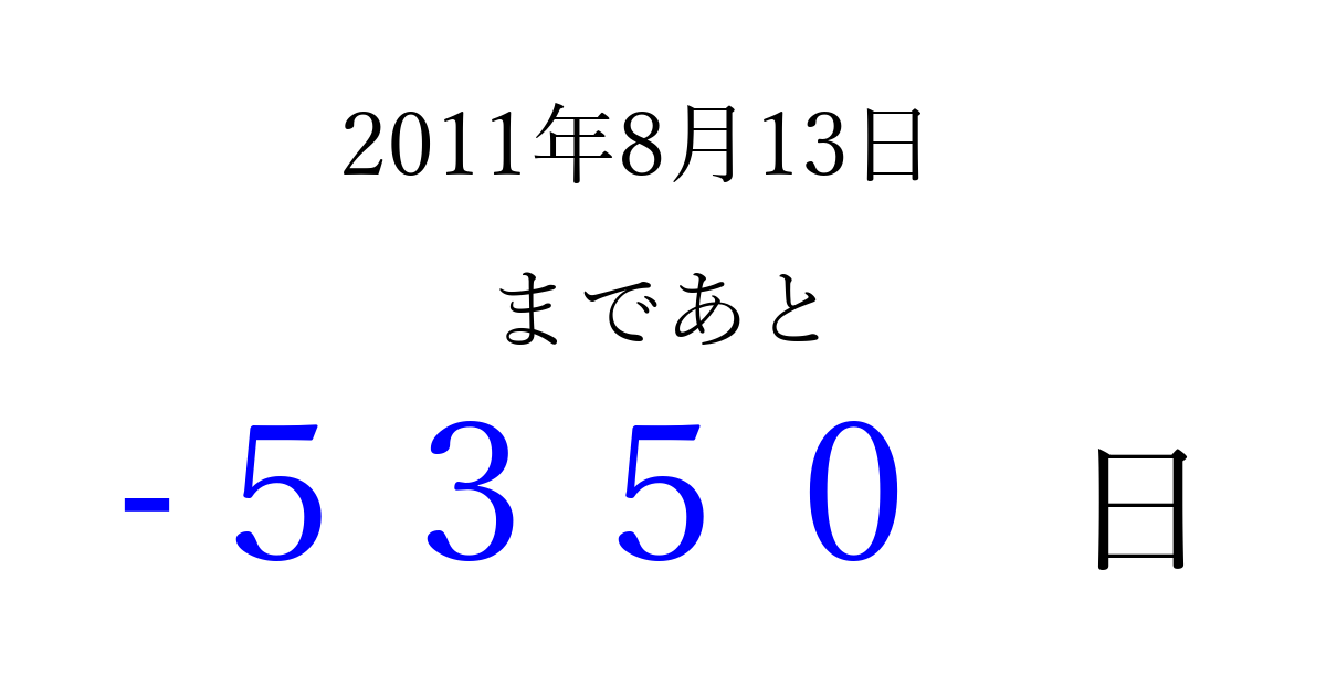 2011年8月13日(土)は もう 0000 日過ぎました 追加すると、トップページからすぐ選べるようになります ※2026/04/06現在の結果です。 最新の状態に更新する ↓シェアして、タイムライン上にカウントダウンを表示しよう!↓ 📤 この結果を共有する Tweet シェア Threads Bluesky 別の日付でカウントダウン 2011年8月のカレンダー このページをブックマークに追加すると、いつでもカウントダウンを確認できます。 (PC: Ctrl+D / Mac: ⌘+D) hitome-notes.comでは以下のページも運営しています。 指定日と期間から日付を計算 | ガチャ確率計算・シミュレーション | プライバシー・ポリシー 運営者:Avocado