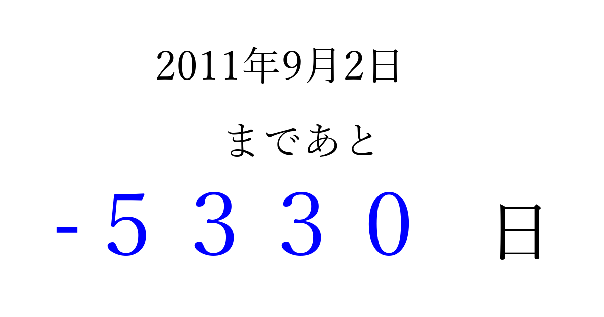 2011年9月2日(金)は もう 0000 日過ぎました 追加すると、トップページからすぐ選べるようになります ※2026/04/06現在の結果です。 最新の状態に更新する ↓シェアして、タイムライン上にカウントダウンを表示しよう!↓ 📤 この結果を共有する Tweet シェア Threads Bluesky 別の日付でカウントダウン 2011年9月のカレンダー このページをブックマークに追加すると、いつでもカウントダウンを確認できます。 (PC: Ctrl+D / Mac: ⌘+D) hitome-notes.comでは以下のページも運営しています。 指定日と期間から日付を計算 | ガチャ確率計算・シミュレーション | プライバシー・ポリシー 運営者:Avocado