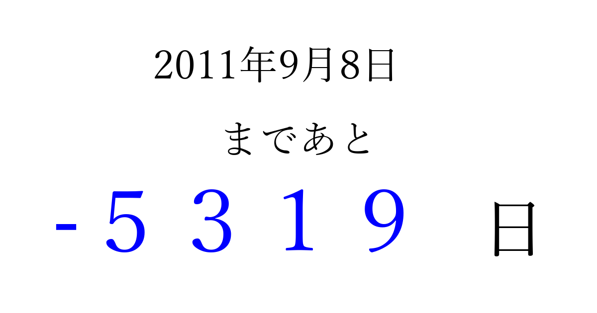 2011年9月8日(木)は もう 0000 日過ぎました 追加すると、トップページからすぐ選べるようになります ※2026/04/01現在の結果です。 最新の状態に更新する ↓シェアして、タイムライン上にカウントダウンを表示しよう!↓ 📤 この結果を共有する Tweet シェア Threads Bluesky 別の日付でカウントダウン 2011年9月のカレンダー このページをブックマークに追加すると、いつでもカウントダウンを確認できます。 (PC: Ctrl+D / Mac: ⌘+D) hitome-notes.comでは以下のページも運営しています。 指定日と期間から日付を計算 | ガチャ確率計算・シミュレーション | プライバシー・ポリシー 運営者:Avocado
