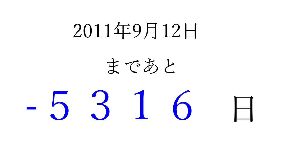 2011年9月12日(月)は もう 0000 日過ぎました 追加すると、トップページからすぐ選べるようになります ※2026/04/02現在の結果です。 最新の状態に更新する ↓シェアして、タイムライン上にカウントダウンを表示しよう!↓ 📤 この結果を共有する Tweet シェア Threads Bluesky 別の日付でカウントダウン 2011年9月のカレンダー このページをブックマークに追加すると、いつでもカウントダウンを確認できます。 (PC: Ctrl+D / Mac: ⌘+D) hitome-notes.comでは以下のページも運営しています。 指定日と期間から日付を計算 | ガチャ確率計算・シミュレーション | プライバシー・ポリシー 運営者:Avocado