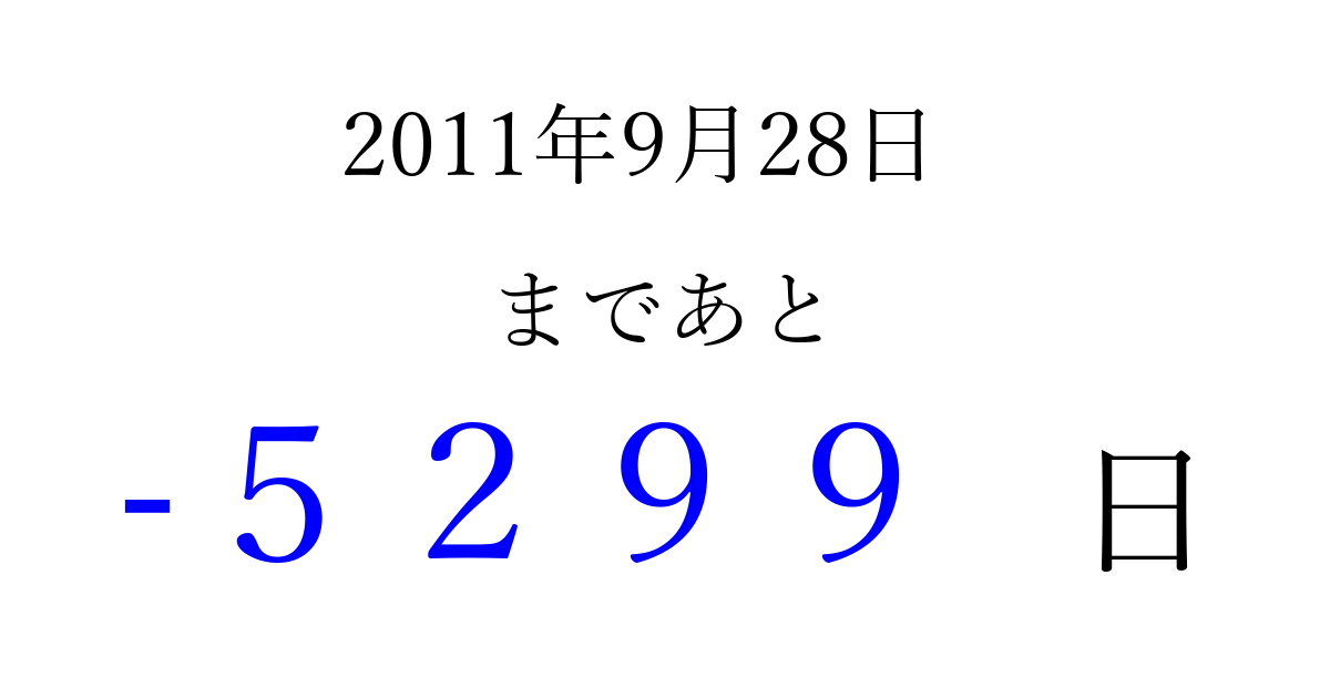 2011年9月28日(水)は もう 0000 日過ぎました 追加すると、トップページからすぐ選べるようになります ※2026/04/01現在の結果です。 最新の状態に更新する ↓シェアして、タイムライン上にカウントダウンを表示しよう!↓ 📤 この結果を共有する Tweet シェア Threads Bluesky 別の日付でカウントダウン 2011年9月のカレンダー このページをブックマークに追加すると、いつでもカウントダウンを確認できます。 (PC: Ctrl+D / Mac: ⌘+D) hitome-notes.comでは以下のページも運営しています。 指定日と期間から日付を計算 | ガチャ確率計算・シミュレーション | プライバシー・ポリシー 運営者:Avocado