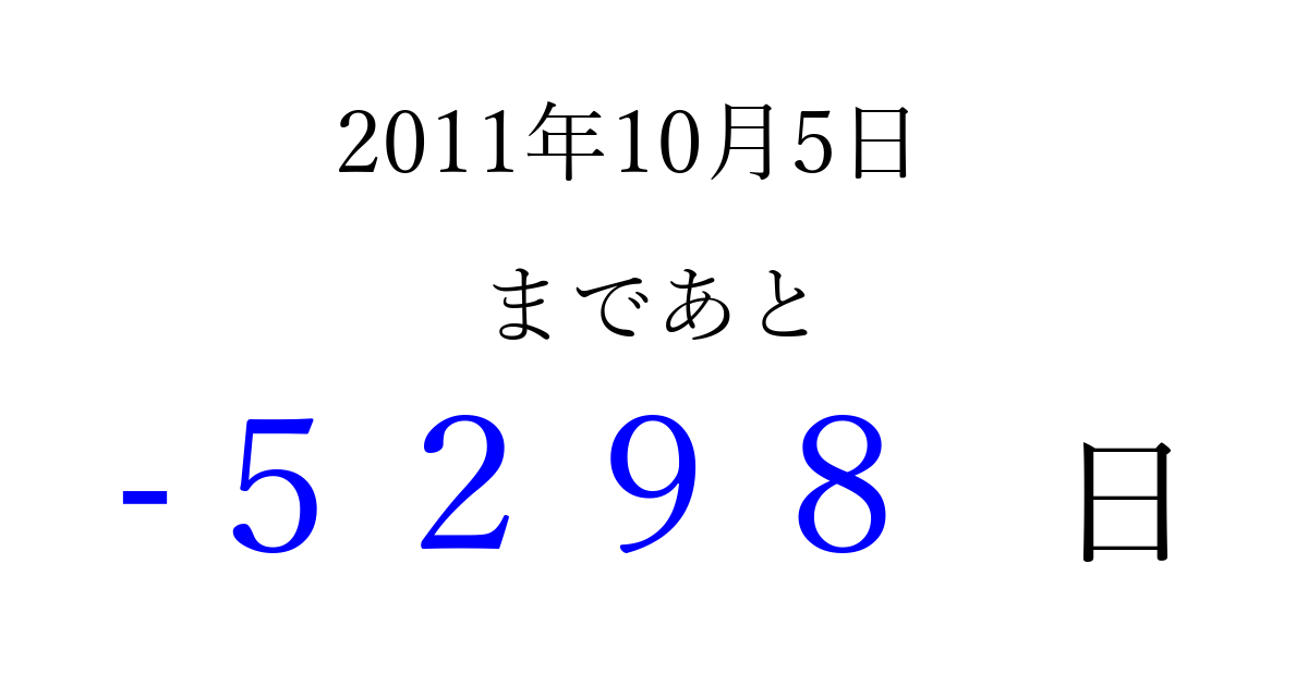 2011年10月5日(水)は もう 0000 日過ぎました 追加すると、トップページからすぐ選べるようになります ※2026/04/07現在の結果です。 最新の状態に更新する ↓シェアして、タイムライン上にカウントダウンを表示しよう!↓ 📤 この結果を共有する Tweet シェア Threads Bluesky 別の日付でカウントダウン 2011年10月のカレンダー このページをブックマークに追加すると、いつでもカウントダウンを確認できます。 (PC: Ctrl+D / Mac: ⌘+D) hitome-notes.comでは以下のページも運営しています。 指定日と期間から日付を計算 | ガチャ確率計算・シミュレーション | プライバシー・ポリシー 運営者:Avocado