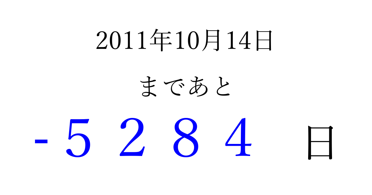 2011年10月14日(金)は もう 0000 日過ぎました 追加すると、トップページからすぐ選べるようになります ※2026/04/02現在の結果です。 最新の状態に更新する ↓シェアして、タイムライン上にカウントダウンを表示しよう!↓ 📤 この結果を共有する Tweet シェア Threads Bluesky 別の日付でカウントダウン 2011年10月のカレンダー このページをブックマークに追加すると、いつでもカウントダウンを確認できます。 (PC: Ctrl+D / Mac: ⌘+D) hitome-notes.comでは以下のページも運営しています。 指定日と期間から日付を計算 | ガチャ確率計算・シミュレーション | プライバシー・ポリシー 運営者:Avocado