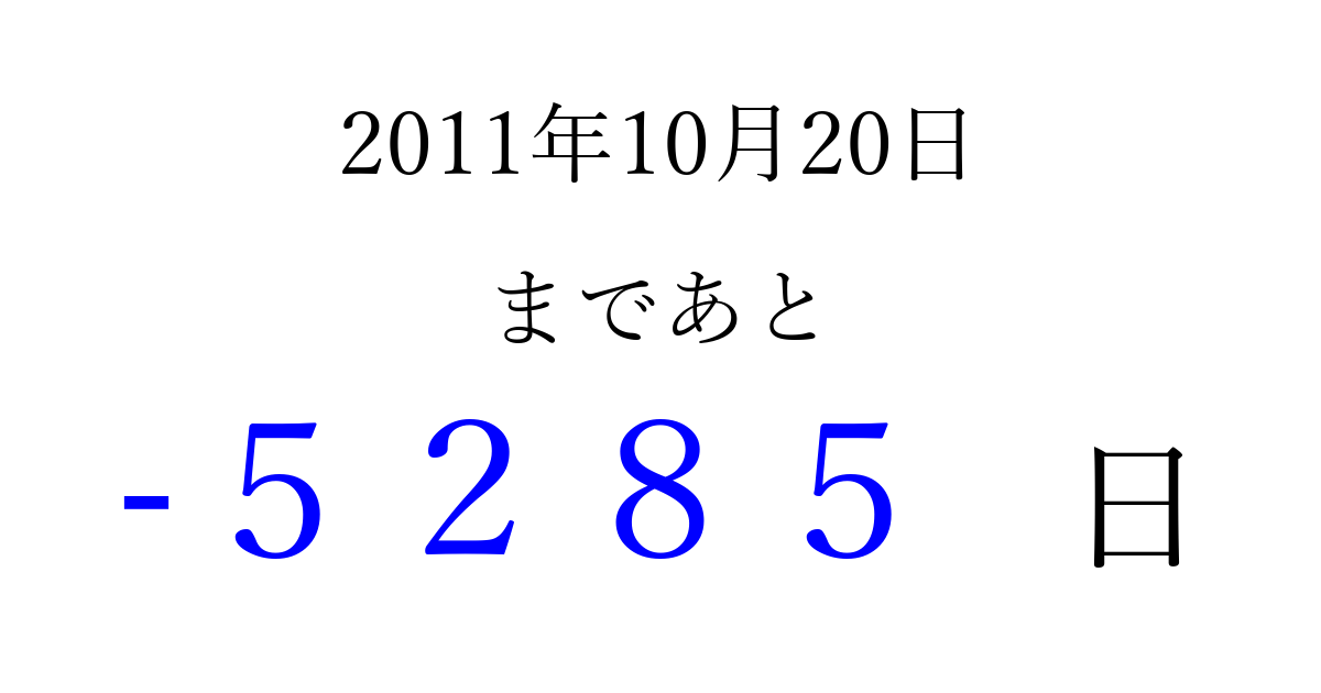 2011年10月20日(木)は もう 0000 日過ぎました 追加すると、トップページからすぐ選べるようになります ※2026/04/09現在の結果です。 最新の状態に更新する ↓シェアして、タイムライン上にカウントダウンを表示しよう!↓ 📤 この結果を共有する Tweet シェア Threads Bluesky 別の日付でカウントダウン 2011年10月のカレンダー このページをブックマークに追加すると、いつでもカウントダウンを確認できます。 (PC: Ctrl+D / Mac: ⌘+D) hitome-notes.comでは以下のページも運営しています。 指定日と期間から日付を計算 | ガチャ確率計算・シミュレーション | プライバシー・ポリシー 運営者:Avocado