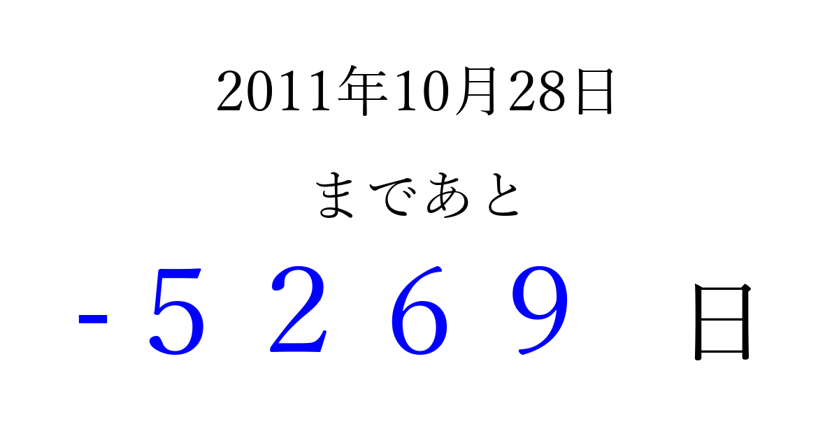 2011年10月28日(金)は もう 0000 日過ぎました 追加すると、トップページからすぐ選べるようになります ※2026/04/01現在の結果です。 最新の状態に更新する ↓シェアして、タイムライン上にカウントダウンを表示しよう!↓ 📤 この結果を共有する Tweet シェア Threads Bluesky 別の日付でカウントダウン 2011年10月のカレンダー このページをブックマークに追加すると、いつでもカウントダウンを確認できます。 (PC: Ctrl+D / Mac: ⌘+D) hitome-notes.comでは以下のページも運営しています。 指定日と期間から日付を計算 | ガチャ確率計算・シミュレーション | プライバシー・ポリシー 運営者:Avocado