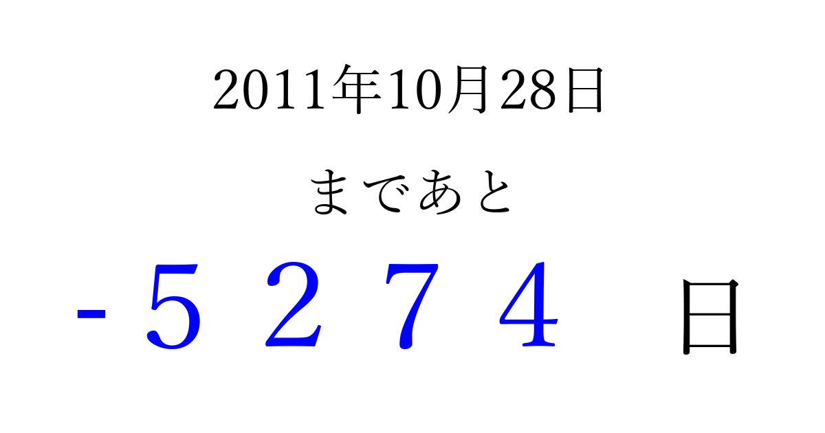 2011年10月28日(金)は もう 0000 日過ぎました 追加すると、トップページからすぐ選べるようになります ※2026/04/06現在の結果です。 最新の状態に更新する ↓シェアして、タイムライン上にカウントダウンを表示しよう!↓ 📤 この結果を共有する Tweet シェア Threads Bluesky 別の日付でカウントダウン 2011年10月のカレンダー このページをブックマークに追加すると、いつでもカウントダウンを確認できます。 (PC: Ctrl+D / Mac: ⌘+D) hitome-notes.comでは以下のページも運営しています。 指定日と期間から日付を計算 | ガチャ確率計算・シミュレーション | プライバシー・ポリシー 運営者:Avocado