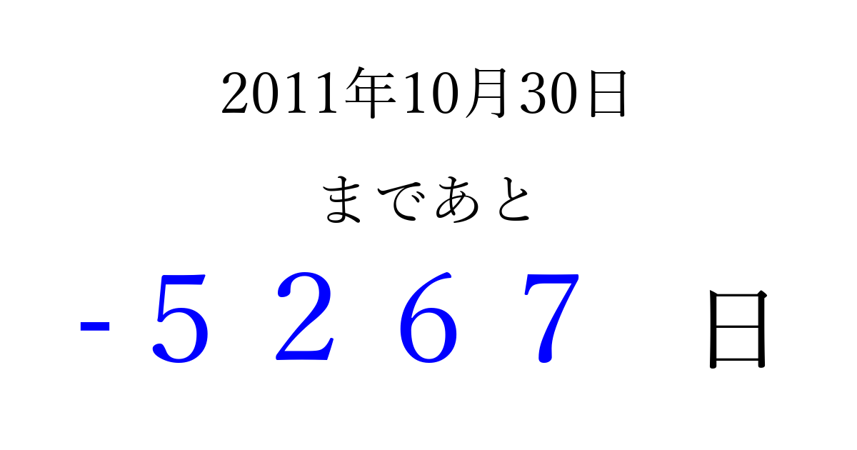 2011年10月30日(日)は もう 0000 日過ぎました 追加すると、トップページからすぐ選べるようになります ※2026/04/01現在の結果です。 最新の状態に更新する ↓シェアして、タイムライン上にカウントダウンを表示しよう!↓ 📤 この結果を共有する Tweet シェア Threads Bluesky 別の日付でカウントダウン 2011年10月のカレンダー このページをブックマークに追加すると、いつでもカウントダウンを確認できます。 (PC: Ctrl+D / Mac: ⌘+D) hitome-notes.comでは以下のページも運営しています。 指定日と期間から日付を計算 | ガチャ確率計算・シミュレーション | プライバシー・ポリシー 運営者:Avocado