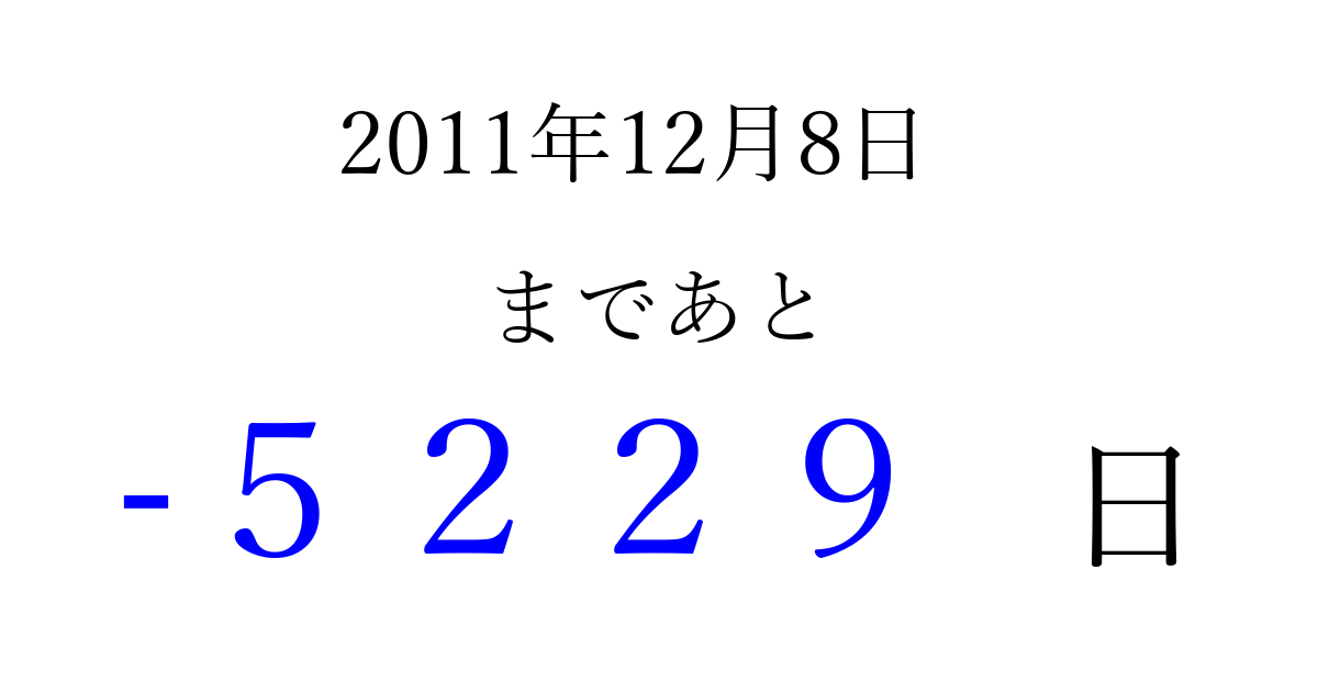 2011年12月8日(木)は もう 0000 日過ぎました 追加すると、トップページからすぐ選べるようになります ※2026/04/02現在の結果です。 最新の状態に更新する ↓シェアして、タイムライン上にカウントダウンを表示しよう!↓ 📤 この結果を共有する Tweet シェア Threads Bluesky 別の日付でカウントダウン 2011年12月のカレンダー このページをブックマークに追加すると、いつでもカウントダウンを確認できます。 (PC: Ctrl+D / Mac: ⌘+D) hitome-notes.comでは以下のページも運営しています。 指定日と期間から日付を計算 | ガチャ確率計算・シミュレーション | プライバシー・ポリシー 運営者:Avocado