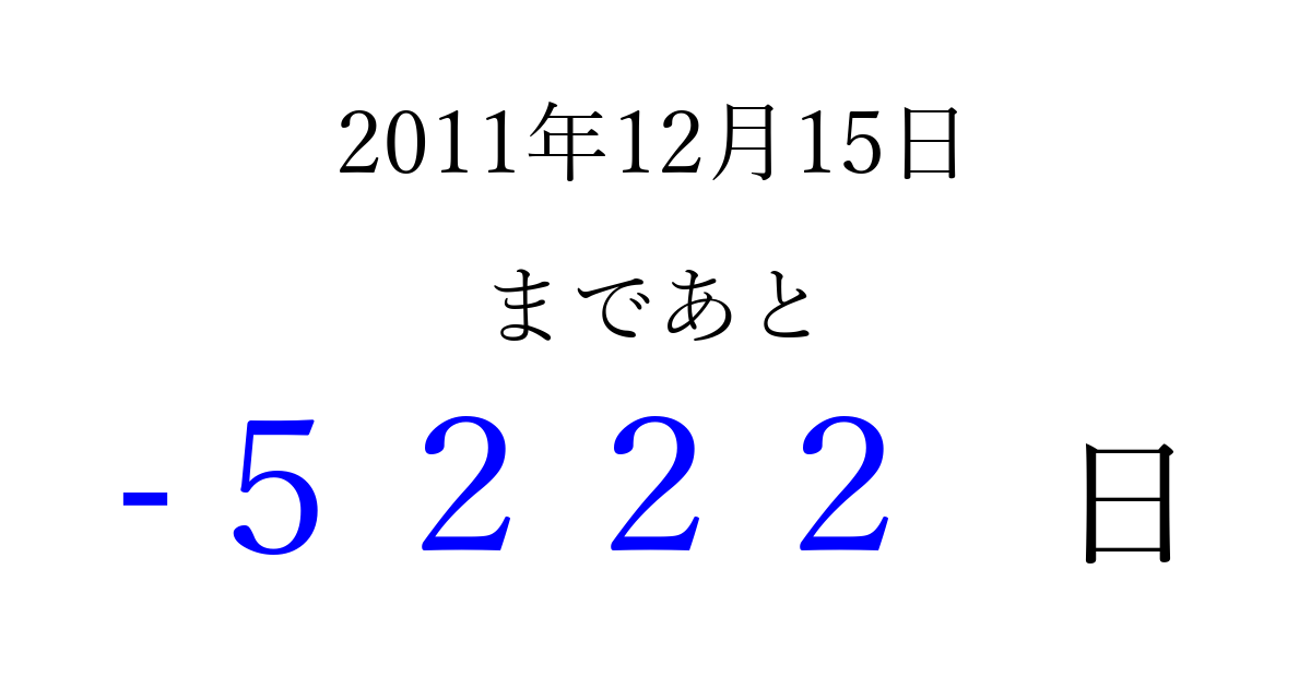 2011年12月15日(木)は もう 0000 日過ぎました 追加すると、トップページからすぐ選べるようになります ※2026/04/02現在の結果です。 最新の状態に更新する ↓シェアして、タイムライン上にカウントダウンを表示しよう!↓ 📤 この結果を共有する Tweet シェア Threads Bluesky 別の日付でカウントダウン 2011年12月のカレンダー このページをブックマークに追加すると、いつでもカウントダウンを確認できます。 (PC: Ctrl+D / Mac: ⌘+D) hitome-notes.comでは以下のページも運営しています。 指定日と期間から日付を計算 | ガチャ確率計算・シミュレーション | プライバシー・ポリシー 運営者:Avocado