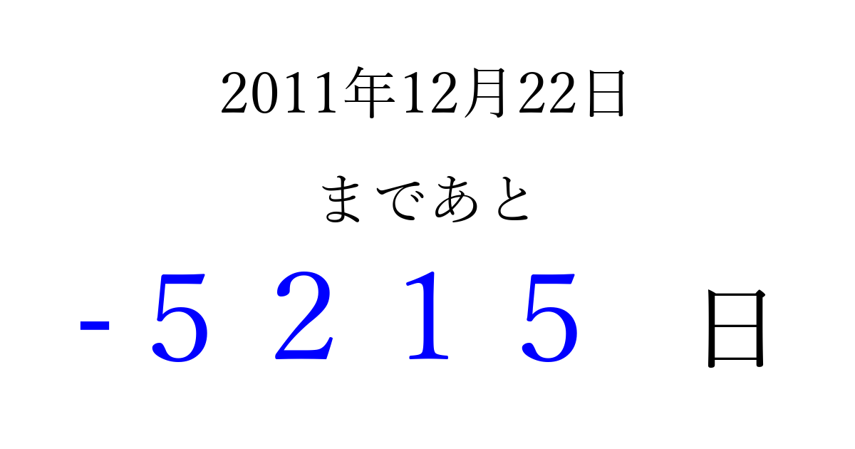 2011年12月22日(木)は もう 0000 日過ぎました 追加すると、トップページからすぐ選べるようになります ※2026/04/02現在の結果です。 最新の状態に更新する ↓シェアして、タイムライン上にカウントダウンを表示しよう!↓ 📤 この結果を共有する Tweet シェア Threads Bluesky 別の日付でカウントダウン 2011年12月のカレンダー このページをブックマークに追加すると、いつでもカウントダウンを確認できます。 (PC: Ctrl+D / Mac: ⌘+D) hitome-notes.comでは以下のページも運営しています。 指定日と期間から日付を計算 | ガチャ確率計算・シミュレーション | プライバシー・ポリシー 運営者:Avocado