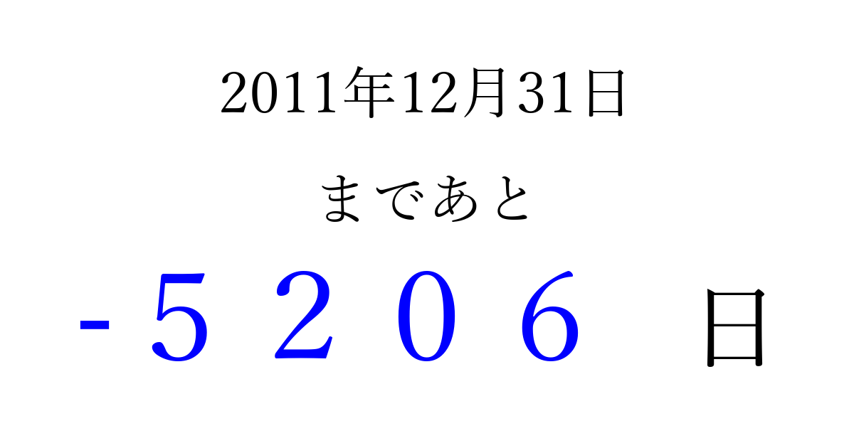 2011年12月31日(土)は もう 0000 日過ぎました 追加すると、トップページからすぐ選べるようになります ※2026/04/02現在の結果です。 最新の状態に更新する ↓シェアして、タイムライン上にカウントダウンを表示しよう!↓ 📤 この結果を共有する Tweet シェア Threads Bluesky 別の日付でカウントダウン 2011年12月のカレンダー このページをブックマークに追加すると、いつでもカウントダウンを確認できます。 (PC: Ctrl+D / Mac: ⌘+D) hitome-notes.comでは以下のページも運営しています。 指定日と期間から日付を計算 | ガチャ確率計算・シミュレーション | プライバシー・ポリシー 運営者:Avocado