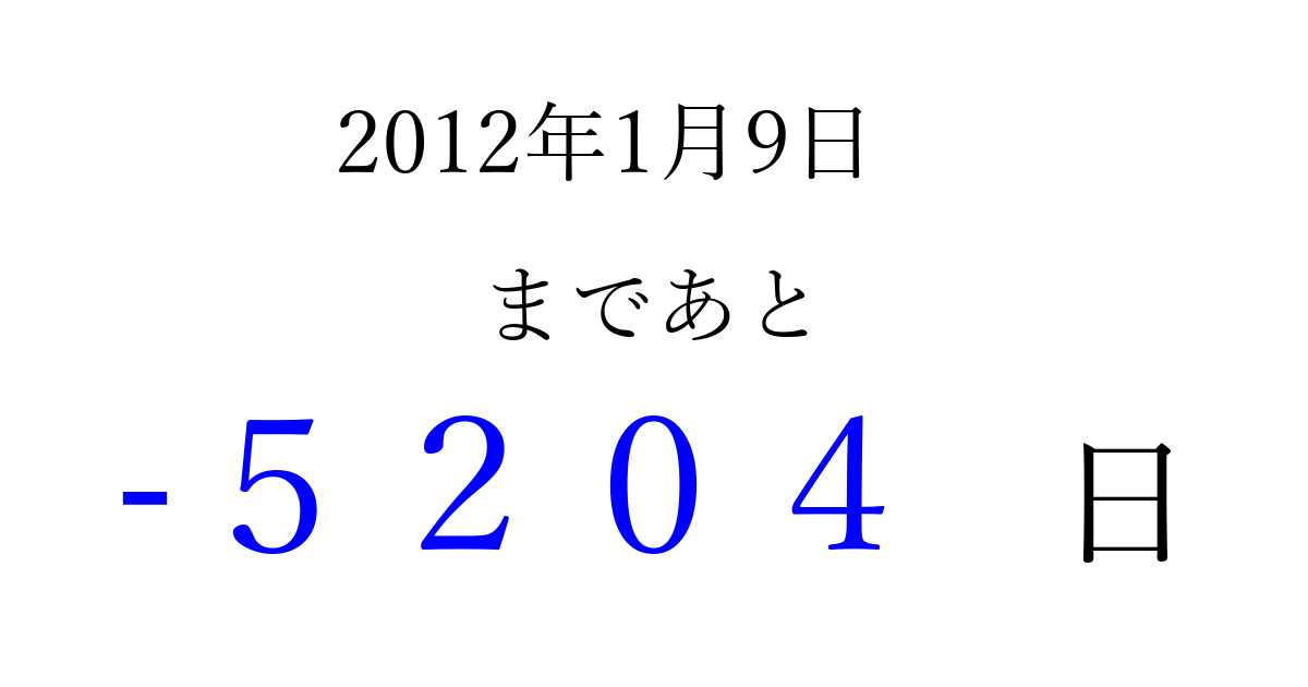 2012年1月9日(月)は もう 0000 日過ぎました 追加すると、トップページからすぐ選べるようになります ※2026/04/09現在の結果です。 最新の状態に更新する ↓シェアして、タイムライン上にカウントダウンを表示しよう!↓ 📤 この結果を共有する Tweet シェア Threads Bluesky 別の日付でカウントダウン 2012年1月のカレンダー このページをブックマークに追加すると、いつでもカウントダウンを確認できます。 (PC: Ctrl+D / Mac: ⌘+D) hitome-notes.comでは以下のページも運営しています。 指定日と期間から日付を計算 | ガチャ確率計算・シミュレーション | プライバシー・ポリシー 運営者:Avocado