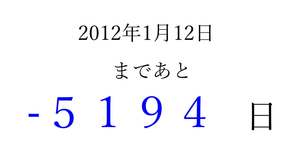2012年1月12日(木)は もう 0000 日過ぎました 追加すると、トップページからすぐ選べるようになります ※2026/04/02現在の結果です。 最新の状態に更新する ↓シェアして、タイムライン上にカウントダウンを表示しよう!↓ 📤 この結果を共有する Tweet シェア Threads Bluesky 別の日付でカウントダウン 2012年1月のカレンダー このページをブックマークに追加すると、いつでもカウントダウンを確認できます。 (PC: Ctrl+D / Mac: ⌘+D) hitome-notes.comでは以下のページも運営しています。 指定日と期間から日付を計算 | ガチャ確率計算・シミュレーション | プライバシー・ポリシー 運営者:Avocado