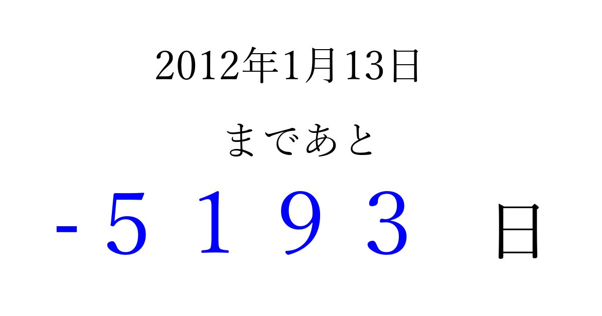 2012年1月13日(金)は もう 0000 日過ぎました 追加すると、トップページからすぐ選べるようになります ※2026/04/02現在の結果です。 最新の状態に更新する ↓シェアして、タイムライン上にカウントダウンを表示しよう!↓ 📤 この結果を共有する Tweet シェア Threads Bluesky 別の日付でカウントダウン 2012年1月のカレンダー このページをブックマークに追加すると、いつでもカウントダウンを確認できます。 (PC: Ctrl+D / Mac: ⌘+D) hitome-notes.comでは以下のページも運営しています。 指定日と期間から日付を計算 | ガチャ確率計算・シミュレーション | プライバシー・ポリシー 運営者:Avocado