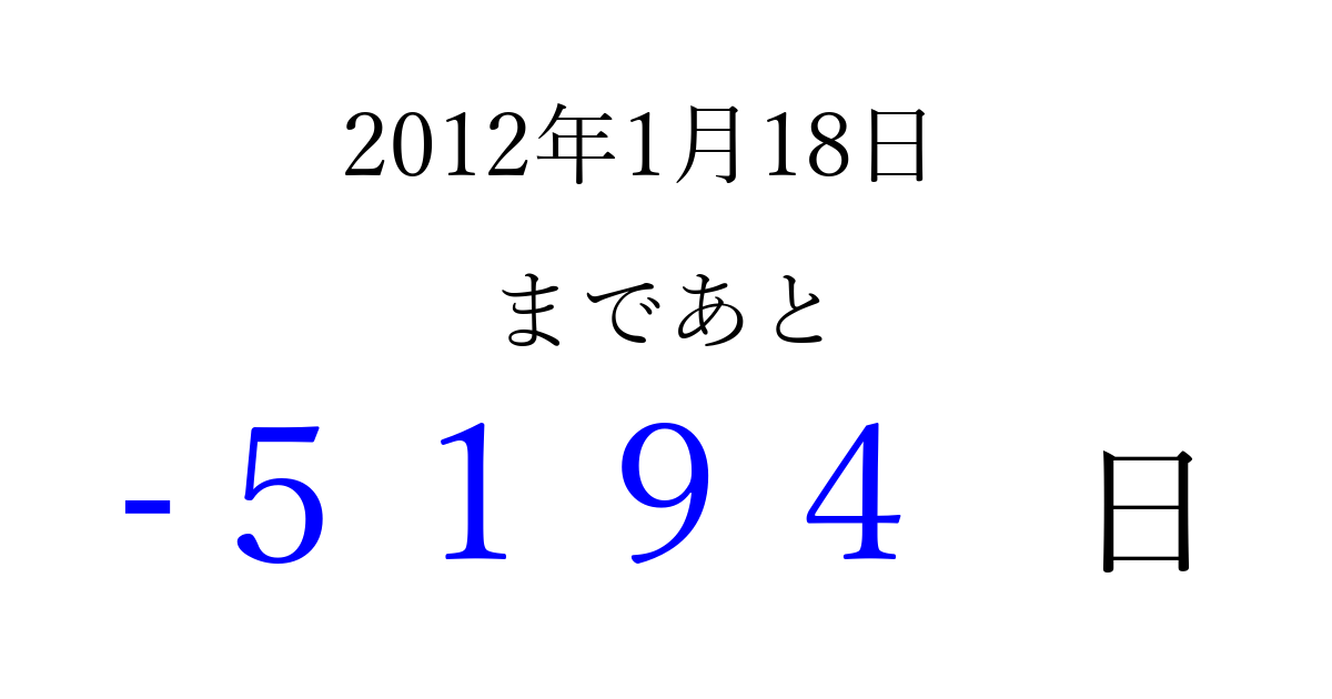 2012年1月18日(水)は もう 0000 日過ぎました 追加すると、トップページからすぐ選べるようになります ※2026/04/08現在の結果です。 最新の状態に更新する ↓シェアして、タイムライン上にカウントダウンを表示しよう!↓ 📤 この結果を共有する Tweet シェア Threads Bluesky 別の日付でカウントダウン 2012年1月のカレンダー このページをブックマークに追加すると、いつでもカウントダウンを確認できます。 (PC: Ctrl+D / Mac: ⌘+D) hitome-notes.comでは以下のページも運営しています。 指定日と期間から日付を計算 | ガチャ確率計算・シミュレーション | プライバシー・ポリシー 運営者:Avocado