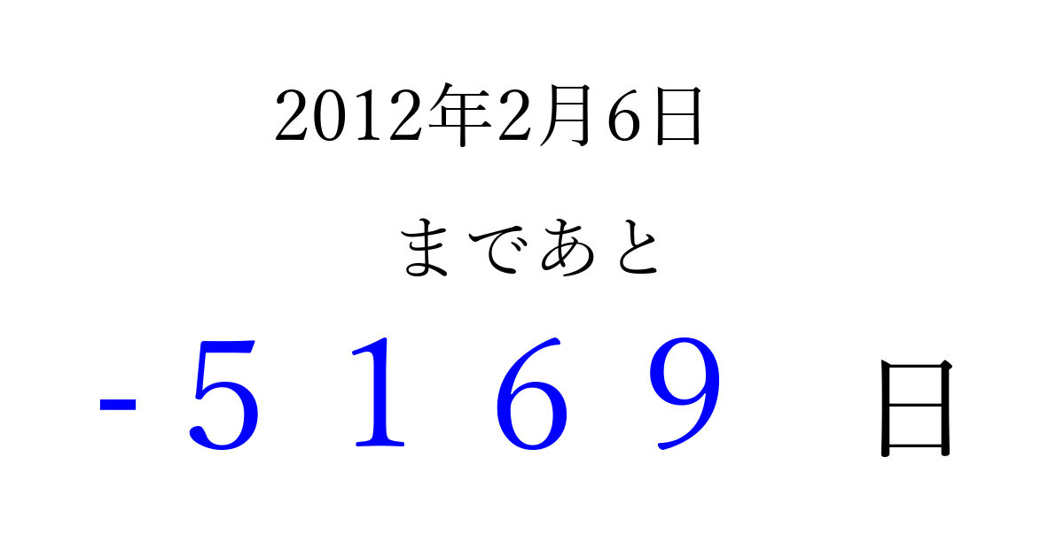 2012年2月6日(月)は もう 0000 日過ぎました 追加すると、トップページからすぐ選べるようになります ※2026/04/02現在の結果です。 最新の状態に更新する ↓シェアして、タイムライン上にカウントダウンを表示しよう!↓ 📤 この結果を共有する Tweet シェア Threads Bluesky 別の日付でカウントダウン 2012年2月のカレンダー このページをブックマークに追加すると、いつでもカウントダウンを確認できます。 (PC: Ctrl+D / Mac: ⌘+D) hitome-notes.comでは以下のページも運営しています。 指定日と期間から日付を計算 | ガチャ確率計算・シミュレーション | プライバシー・ポリシー 運営者:Avocado