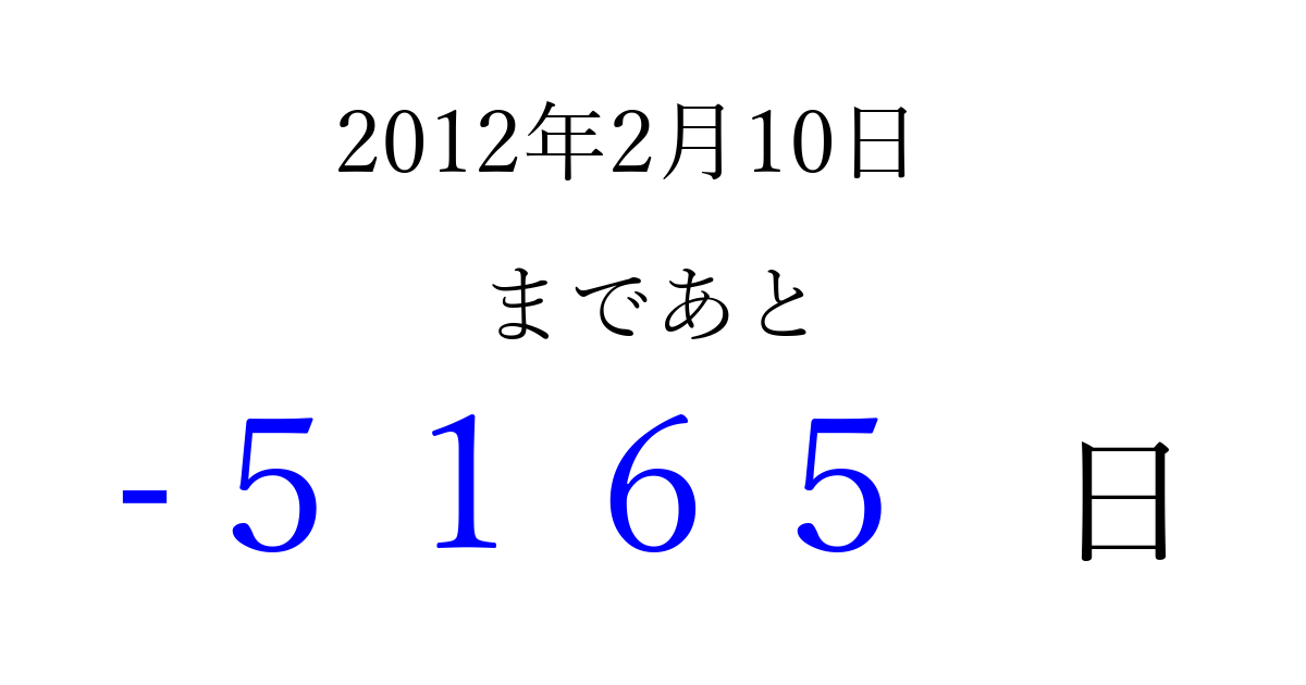 2012年2月10日(金)は もう 0000 日過ぎました 追加すると、トップページからすぐ選べるようになります ※2026/04/02現在の結果です。 最新の状態に更新する ↓シェアして、タイムライン上にカウントダウンを表示しよう!↓ 📤 この結果を共有する Tweet シェア Threads Bluesky 別の日付でカウントダウン 2012年2月のカレンダー このページをブックマークに追加すると、いつでもカウントダウンを確認できます。 (PC: Ctrl+D / Mac: ⌘+D) hitome-notes.comでは以下のページも運営しています。 指定日と期間から日付を計算 | ガチャ確率計算・シミュレーション | プライバシー・ポリシー 運営者:Avocado