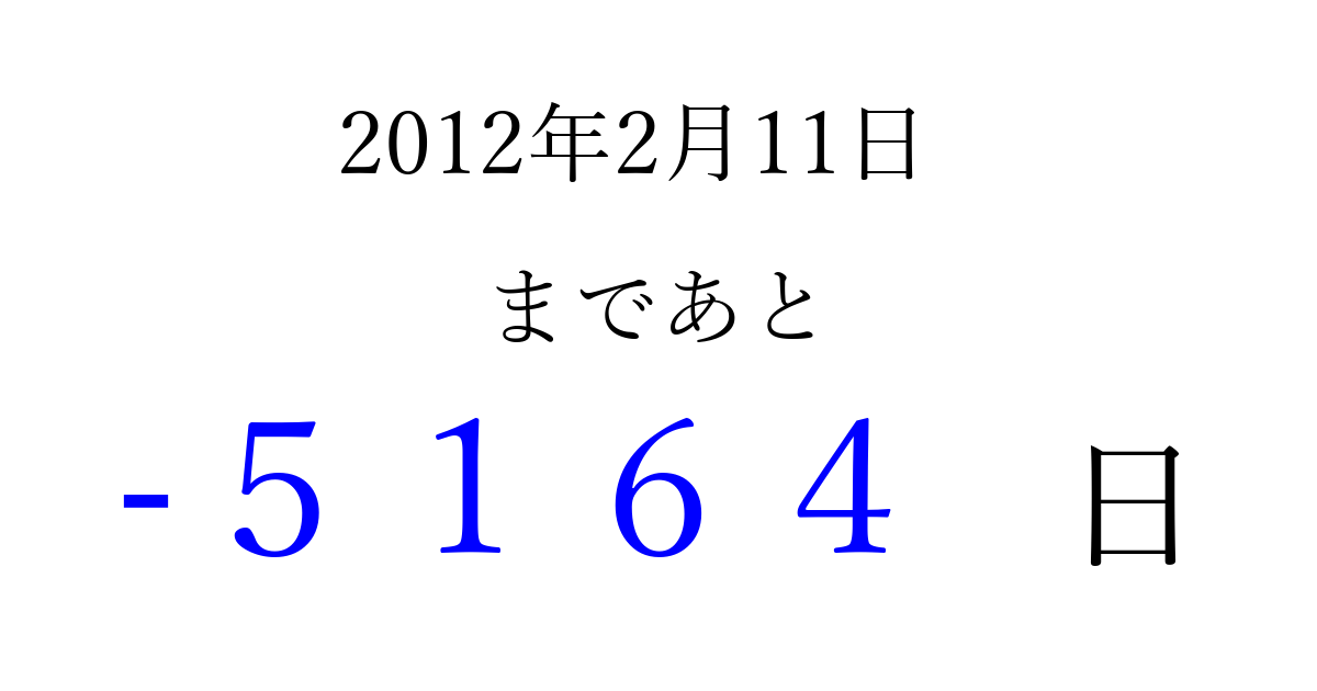 2012年2月11日(土)は もう 0000 日過ぎました 追加すると、トップページからすぐ選べるようになります ※2026/04/02現在の結果です。 最新の状態に更新する ↓シェアして、タイムライン上にカウントダウンを表示しよう!↓ 📤 この結果を共有する Tweet シェア Threads Bluesky 別の日付でカウントダウン 2012年2月のカレンダー このページをブックマークに追加すると、いつでもカウントダウンを確認できます。 (PC: Ctrl+D / Mac: ⌘+D) hitome-notes.comでは以下のページも運営しています。 指定日と期間から日付を計算 | ガチャ確率計算・シミュレーション | プライバシー・ポリシー 運営者:Avocado