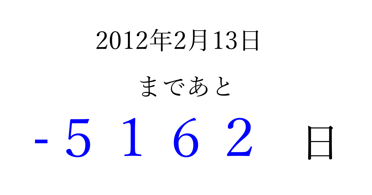 2012年2月13日(月)は もう 0000 日過ぎました 追加すると、トップページからすぐ選べるようになります ※2026/04/02現在の結果です。 最新の状態に更新する ↓シェアして、タイムライン上にカウントダウンを表示しよう!↓ 📤 この結果を共有する Tweet シェア Threads Bluesky 別の日付でカウントダウン 2012年2月のカレンダー このページをブックマークに追加すると、いつでもカウントダウンを確認できます。 (PC: Ctrl+D / Mac: ⌘+D) hitome-notes.comでは以下のページも運営しています。 指定日と期間から日付を計算 | ガチャ確率計算・シミュレーション | プライバシー・ポリシー 運営者:Avocado