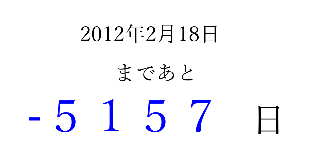 2012年2月18日(土)は もう 0000 日過ぎました 追加すると、トップページからすぐ選べるようになります ※2026/04/02現在の結果です。 最新の状態に更新する ↓シェアして、タイムライン上にカウントダウンを表示しよう!↓ 📤 この結果を共有する Tweet シェア Threads Bluesky 別の日付でカウントダウン 2012年2月のカレンダー このページをブックマークに追加すると、いつでもカウントダウンを確認できます。 (PC: Ctrl+D / Mac: ⌘+D) hitome-notes.comでは以下のページも運営しています。 指定日と期間から日付を計算 | ガチャ確率計算・シミュレーション | プライバシー・ポリシー 運営者:Avocado