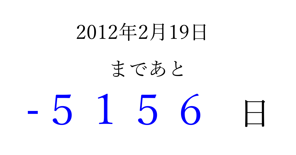 2012年2月19日(日)は もう 0000 日過ぎました 追加すると、トップページからすぐ選べるようになります ※2026/04/02現在の結果です。 最新の状態に更新する ↓シェアして、タイムライン上にカウントダウンを表示しよう!↓ 📤 この結果を共有する Tweet シェア Threads Bluesky 別の日付でカウントダウン 2012年2月のカレンダー このページをブックマークに追加すると、いつでもカウントダウンを確認できます。 (PC: Ctrl+D / Mac: ⌘+D) hitome-notes.comでは以下のページも運営しています。 指定日と期間から日付を計算 | ガチャ確率計算・シミュレーション | プライバシー・ポリシー 運営者:Avocado