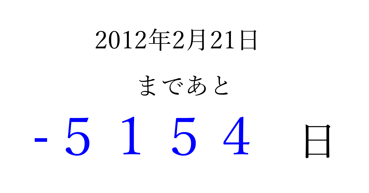 2012年2月21日(火)は もう 0000 日過ぎました 追加すると、トップページからすぐ選べるようになります ※2026/04/02現在の結果です。 最新の状態に更新する ↓シェアして、タイムライン上にカウントダウンを表示しよう!↓ 📤 この結果を共有する Tweet シェア Threads Bluesky 別の日付でカウントダウン 2012年2月のカレンダー このページをブックマークに追加すると、いつでもカウントダウンを確認できます。 (PC: Ctrl+D / Mac: ⌘+D) hitome-notes.comでは以下のページも運営しています。 指定日と期間から日付を計算 | ガチャ確率計算・シミュレーション | プライバシー・ポリシー 運営者:Avocado