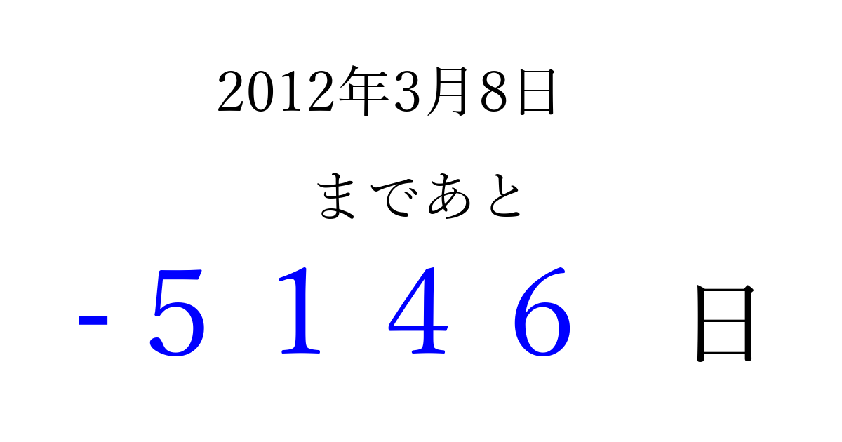 2012年3月8日(木)は もう 0000 日過ぎました 追加すると、トップページからすぐ選べるようになります ※2026/04/10現在の結果です。 最新の状態に更新する ↓シェアして、タイムライン上にカウントダウンを表示しよう!↓ 📤 この結果を共有する Tweet シェア Threads Bluesky 別の日付でカウントダウン 2012年3月のカレンダー このページをブックマークに追加すると、いつでもカウントダウンを確認できます。 (PC: Ctrl+D / Mac: ⌘+D) hitome-notes.comでは以下のページも運営しています。 指定日と期間から日付を計算 | ガチャ確率計算・シミュレーション | プライバシー・ポリシー 運営者:Avocado