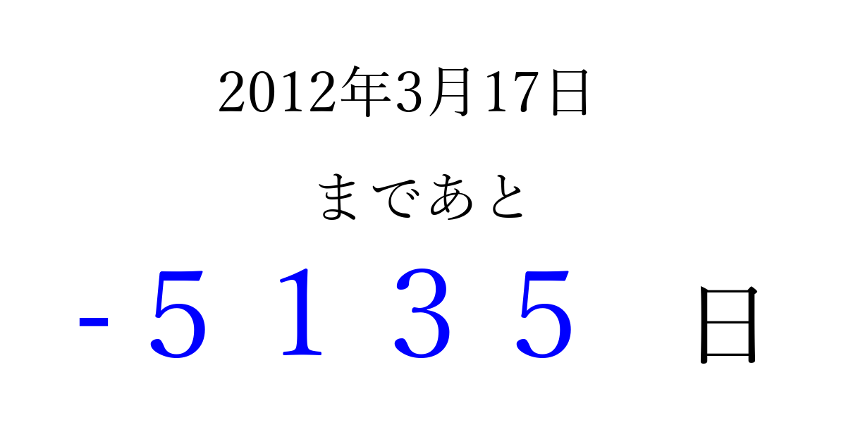 2012年3月17日(土)は もう 0000 日過ぎました 追加すると、トップページからすぐ選べるようになります ※2026/04/08現在の結果です。 最新の状態に更新する ↓シェアして、タイムライン上にカウントダウンを表示しよう!↓ 📤 この結果を共有する Tweet シェア Threads Bluesky 別の日付でカウントダウン 2012年3月のカレンダー このページをブックマークに追加すると、いつでもカウントダウンを確認できます。 (PC: Ctrl+D / Mac: ⌘+D) hitome-notes.comでは以下のページも運営しています。 指定日と期間から日付を計算 | ガチャ確率計算・シミュレーション | プライバシー・ポリシー 運営者:Avocado