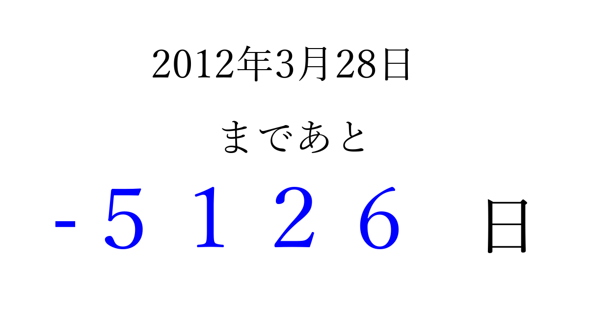 2012年3月28日(水)は もう 0000 日過ぎました 追加すると、トップページからすぐ選べるようになります ※2026/04/10現在の結果です。 最新の状態に更新する ↓シェアして、タイムライン上にカウントダウンを表示しよう!↓ 📤 この結果を共有する Tweet シェア Threads Bluesky 別の日付でカウントダウン 2012年3月のカレンダー このページをブックマークに追加すると、いつでもカウントダウンを確認できます。 (PC: Ctrl+D / Mac: ⌘+D) hitome-notes.comでは以下のページも運営しています。 指定日と期間から日付を計算 | ガチャ確率計算・シミュレーション | プライバシー・ポリシー 運営者:Avocado