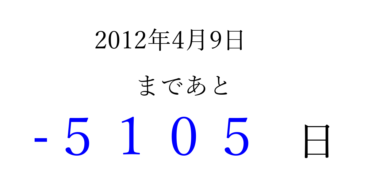 2012年4月9日(月)は もう 0000 日過ぎました 追加すると、トップページからすぐ選べるようになります ※2026/04/01現在の結果です。 最新の状態に更新する ↓シェアして、タイムライン上にカウントダウンを表示しよう!↓ 📤 この結果を共有する Tweet シェア Threads Bluesky 別の日付でカウントダウン 2012年4月のカレンダー このページをブックマークに追加すると、いつでもカウントダウンを確認できます。 (PC: Ctrl+D / Mac: ⌘+D) hitome-notes.comでは以下のページも運営しています。 指定日と期間から日付を計算 | ガチャ確率計算・シミュレーション | プライバシー・ポリシー 運営者:Avocado