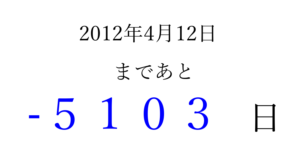 2012年4月12日(木)は もう 0000 日過ぎました 追加すると、トップページからすぐ選べるようになります ※2026/04/02現在の結果です。 最新の状態に更新する ↓シェアして、タイムライン上にカウントダウンを表示しよう!↓ 📤 この結果を共有する Tweet シェア Threads Bluesky 別の日付でカウントダウン 2012年4月のカレンダー このページをブックマークに追加すると、いつでもカウントダウンを確認できます。 (PC: Ctrl+D / Mac: ⌘+D) hitome-notes.comでは以下のページも運営しています。 指定日と期間から日付を計算 | ガチャ確率計算・シミュレーション | プライバシー・ポリシー 運営者:Avocado
