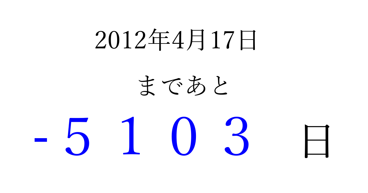 2012年4月17日(火)は もう 0000 日過ぎました 追加すると、トップページからすぐ選べるようになります ※2026/04/07現在の結果です。 最新の状態に更新する ↓シェアして、タイムライン上にカウントダウンを表示しよう!↓ 📤 この結果を共有する Tweet シェア Threads Bluesky 別の日付でカウントダウン 2012年4月のカレンダー このページをブックマークに追加すると、いつでもカウントダウンを確認できます。 (PC: Ctrl+D / Mac: ⌘+D) hitome-notes.comでは以下のページも運営しています。 指定日と期間から日付を計算 | ガチャ確率計算・シミュレーション | プライバシー・ポリシー 運営者:Avocado