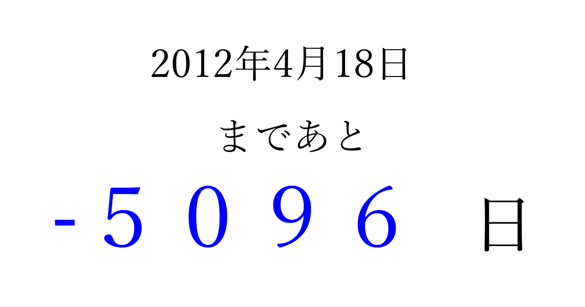 2012年4月18日(水)は もう 0000 日過ぎました 追加すると、トップページからすぐ選べるようになります ※2026/04/01現在の結果です。 最新の状態に更新する ↓シェアして、タイムライン上にカウントダウンを表示しよう!↓ 📤 この結果を共有する Tweet シェア Threads Bluesky 別の日付でカウントダウン 2012年4月のカレンダー このページをブックマークに追加すると、いつでもカウントダウンを確認できます。 (PC: Ctrl+D / Mac: ⌘+D) hitome-notes.comでは以下のページも運営しています。 指定日と期間から日付を計算 | ガチャ確率計算・シミュレーション | プライバシー・ポリシー 運営者:Avocado