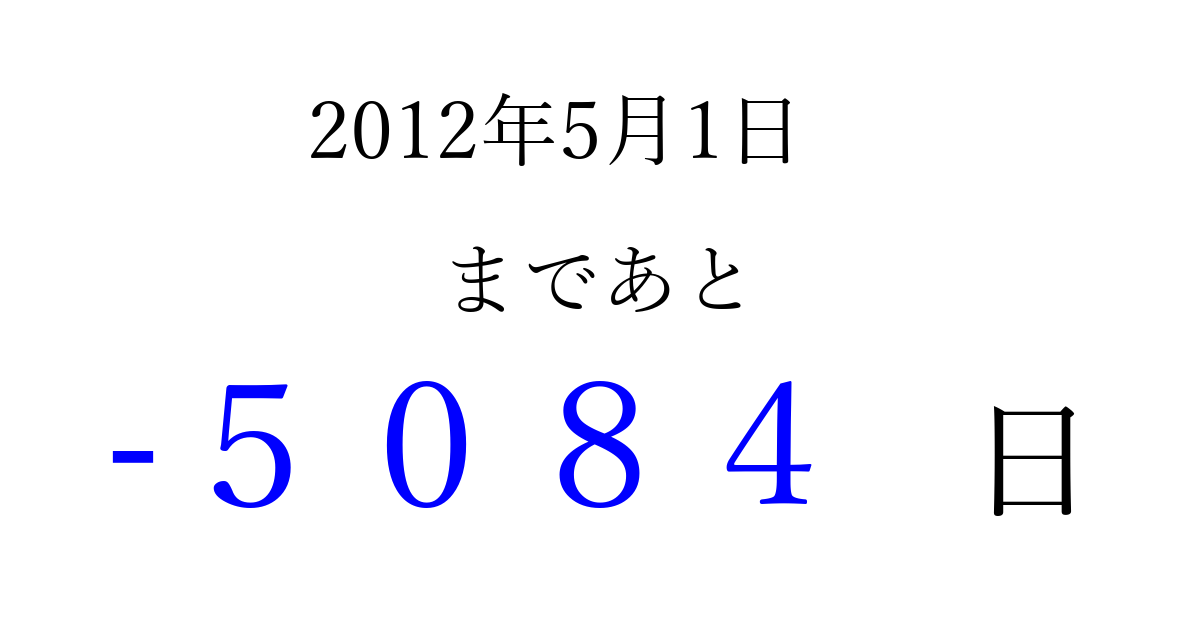 2012年5月1日(火)は もう 0000 日過ぎました 追加すると、トップページからすぐ選べるようになります ※2026/04/02現在の結果です。 最新の状態に更新する ↓シェアして、タイムライン上にカウントダウンを表示しよう!↓ 📤 この結果を共有する Tweet シェア Threads Bluesky 別の日付でカウントダウン 2012年5月のカレンダー このページをブックマークに追加すると、いつでもカウントダウンを確認できます。 (PC: Ctrl+D / Mac: ⌘+D) hitome-notes.comでは以下のページも運営しています。 指定日と期間から日付を計算 | ガチャ確率計算・シミュレーション | プライバシー・ポリシー 運営者:Avocado